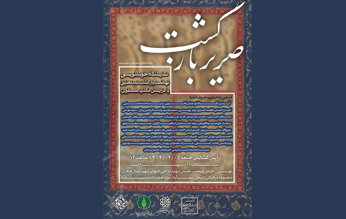 نمایشگاه خوشنویسی «صریر بازگشت» با عنوان «نهضت بازگشت نستعلیق با گرایش مکتب صفوی» روز جمعه 5 اردیبهشتماه ساعت 14 در مجموعه فرهنگی تاریخی سعدآباد «موزه خط و کتابت میرعماد» افتتاح میشود.